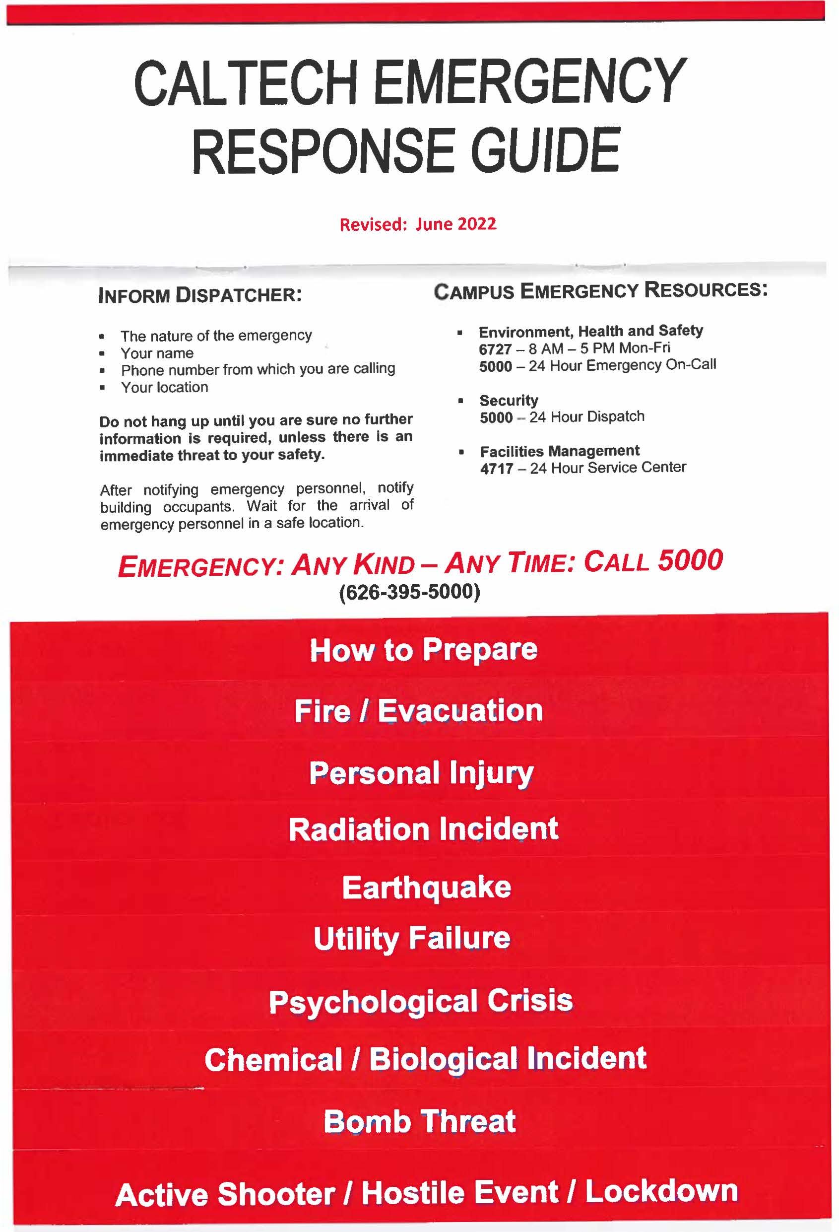 For a copy of the Caltech Emergency Response Guide, please contact emergencypreparedness @caltech.edu